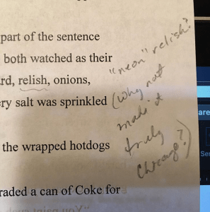 Soon as it arrived, I tore open the package and plopped down to read through each page. She had typed some overall comments that will be supremely helpful, as well as wrote notes and marked errors. When I got to this one, I couldn’t help but smile. It is important, after all, to get the right beta readers – folks you can trust to be honest with you, even if it means being critical, but also folks who can make sure the story you are telling is an authentic one. Right down to the relish.