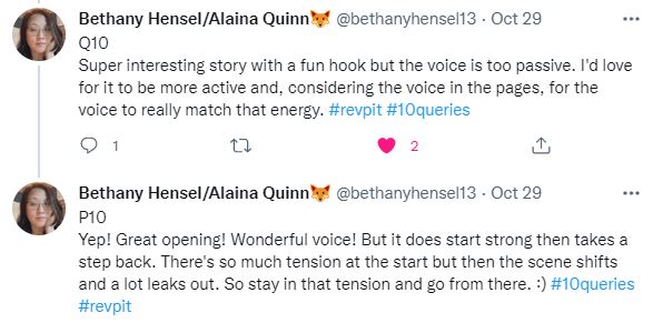 As for #10Queries – I had heard of the event before, and I have certainly seen the hashtag on my twitter feed. This was the first time I entered, though, and I was thrilled to be selected to participate. On the day of the event, I read over each and every #10Queries thread that the editors tweeted – and I had no idea which one was mine. (They put up feedback without too many specific details in an effort to help all writers see the common errors that we make on our queries and first five pages, along with the feedback from the editors.)