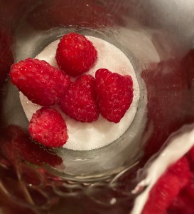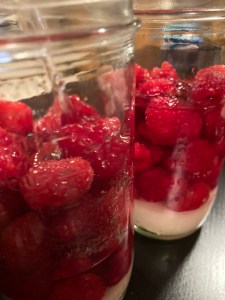 Using two one quart mason jars, I dropped a half cup of granulated sugar into the bottom of each, followed by a pint of fresh, rinsed raspberries in each, and then topped with vodka (you need a minimum of 80 proof for the alcohol to preserve the fruit – and remember that the taste of the vodka will affect the final product, so I recommend a good vodka – one that doesn’t taste like hairspray…looking at you, broke college-aged me). Store in a cool, dark place (mine are in my pantry), and give a bit of a shake once a week to help dislodge the sugar. Once the sugar has dissolved, you’re good to go – but, of course, the longer you let it sit, the strong the raspberry taste will be.