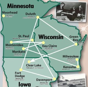 What I didn’t know was that on Feb 1, 1959, these three played their second to last show at the Riverside Ballroom (meaning the specific night and location in relation to their deaths). They would go on to Clear Lake, IA, the next day – and then Holly chartered that fateful plane – for him, Tommy Allsup, and Waylon Jennings. They were, after all, zig-zagging around the Midwest in winter, with several hundred miles between back-to-back venues. (Carl Bunch ended up leaving the tour previous to this due to frost bite.) Jennings would give up his seat to Big Bopper (who had the fly), and Allsup would lose his seat to Valens in a coin toss.