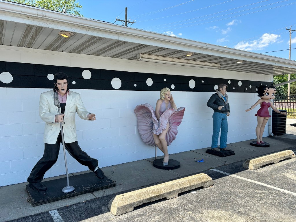 Braidwood, IL – One of the most common things you’ll find on the route are old-school diners, which I have always loved (though can’t often eat at because I don’t eat meat and fried food makes me queasy). But I had to stop here for lunch. Y’all – when I tell you the bathroom was PLASTERED with Elvis pictures… there wasn’t a square inch to spare. Good luck if you’ve got a shy bladder like I do… It was a cute stop with lots of photo ops.
