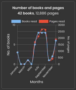 While I only read two more books than last year, they were apparently longer – I read 4,526 more pages than last year – and that feels like I achieved my overall goal.