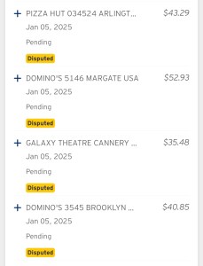 The charge? $48.96 at Domino’s (this one was declined by the company, so I have no record of where it was attempted). At the time of the charge, I was at a game night with friends – and no, we weren’t eating pizza. So I replied that it was not me, and they auto-replied with a number to call. They asked about a few more charges – and no, I was not in four OTHER states (Brooklyn, NY; Las Vegas, NV; Arlington, TX; Margate, FL – that last one I’ve never even heard of) simultaneously (7:54, 8:03, 8:06, 8:11) spending a total of $172.55 in trashy pizza. (I mean no offense by that term – there is a time and place for such pizza. But if I’m spending this much, it’s going to be for GOOD pizza. Though even then, I’ve never spent forty bucks on a single trip to a Lou Malnati’s…)