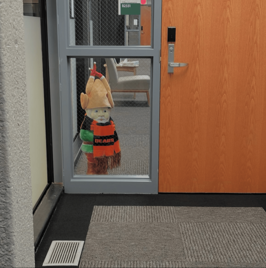 Starting last semester, I taught in a classroom/hallway I hadn’t taught in for quite a while. Right across from my classroom door, there’s an admin office door with a window that runs down the left side of it. And sitting in this window was a creepy little gnome. I hadn’t thought to take a photo of that version, of the gnome just being his little gnome self – because I had no idea what I was in for with this little creeper.