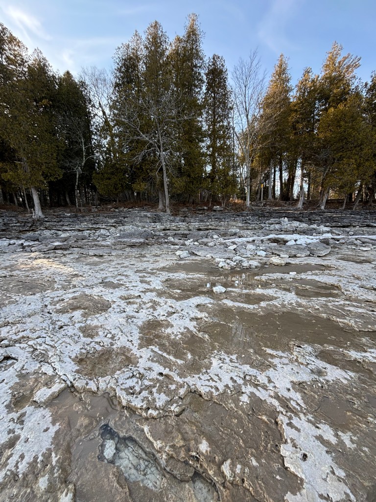 But my last trek, the water was so low – it was almost nerve wracking how far out I could walk onto the limestone bed. The wind was minimal, so there weren’t really splashes. I should be in water up to my knees standing here and looking back at the trees: