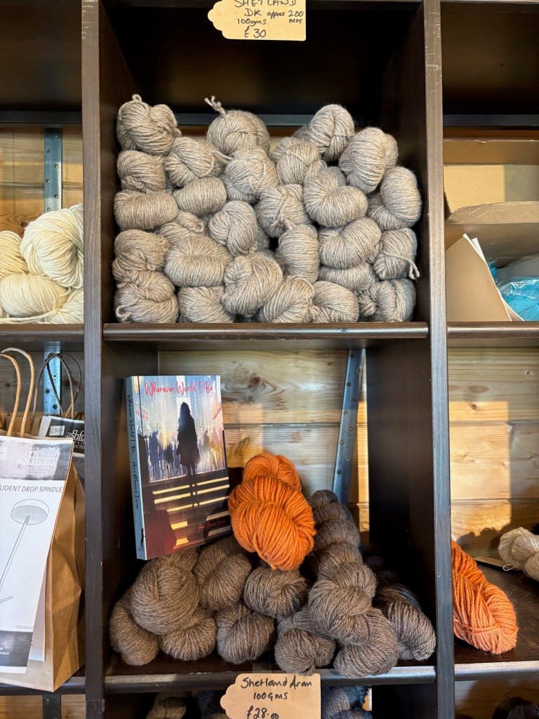 A few pages later (227), Lucy et al. check out a fun little yarn shop. In our reality, we had the navigation code…which sent us down the tiniest road I had seen yet – a single-lane residential road that was literally the width of our car. Thankfully, my travel buddy had an eSim and used his phone’s GPS, and we found it. The shop tender was friendly and chatty (not in a bad way), and I may have found some yarn to bring home, too. (The wool comes from the sheep in a field nearby.)