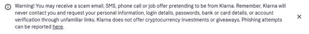 - Next, Klarna is a real business – you can look it up. They have this warning at the top of their page even letting you know about the scam: