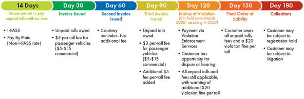 - Also, the Illinois Tollway is not part of the DMV – it’s a separate organization. It also does not contact the DMV about unpaid fines, and the DMV is not in charge of sending notices of unpaid fines. The Illinois Tollway itself can put a hold on your registration. This will, of course, then flag at the DMV. (But note that the graphic above says they “may” – not that they will. Same note about litigation.) Again, if there is an actual missed toll and fine, just make sure your address is up to date at the DMV, and you will receive the first notice, which you can pay and avoid getting anywhere near collections.
