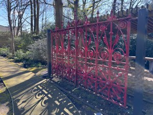 They have since removed the original gate from the front entrance (which is good, because the replacement is covered in graffiti…because of course people can’t resist [sigh]). The original gate sits in the garden, though. It’s beautiful work.